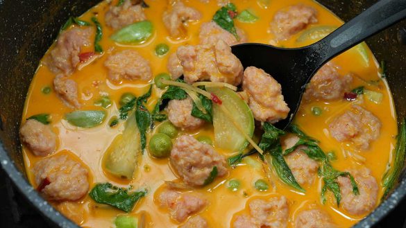 แกงเผ็ดหมูเด้ง ในภาษอังกฤษนิยมใช้คำว่า Red Curry With Bouncy Pork เป็นการทำแกงเผ็ดใส่กะทิที่นำเอาหมูเด้งที่ภาษอังกฤษใช้คำว่า Bouncy Pork มาแกงกับน้ำแกงใส่กะทิในรูปแบบของแกงเผ็ด ซึ่งเป็นแกงที่นิยมทำทานกันเป็นวงกว้าง โดยพื้นฐานของแกเผ็ดนั้น มักเป็นแกงที่คล้ายๆกันโดยมักนำเอามะเขือมาเป็นผักหลักในการใส่ลงไปและใช้พริกแกงเผ็ด ในส่วนของเนื้อสัตว์ก็จะแตกต่างกันออกไปตามความชอบ เช่นเนื้อหมู เนื้อไก่ เนื้อวัว เป็นต้นและยังสามารถนำเอาเนื้อสัตว์ในรูปแบบต่างๆมาใส่ได้เช่น ลูกชิ้นหรือหมูเด้งอย่างในเมนูนี้ โจ๊กใช้หมูเด้งมาทำเป็นเมนูแกงเผ็ดใส่มะเขือครับ เดี๋ยวมาดุกันว่าแกงเผ็ดนั้นต้องใส่อะไรบ้างกันดีกว่า …